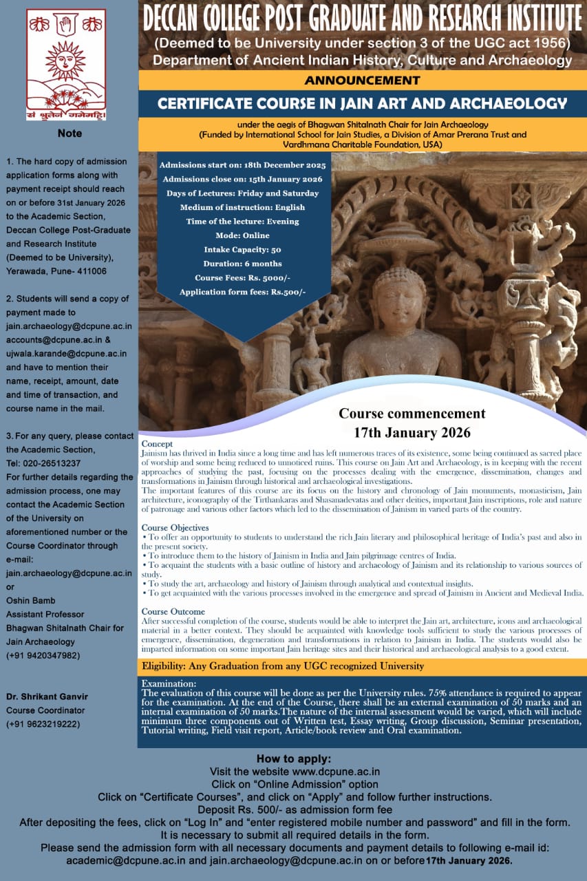 Institute (Deemed to be University, Pune) is offering a Certificate Course in Jain Art and Archaeology from